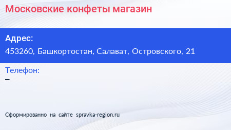 Московские конфеты, магазин по адресу 453260, Башкортостан, Салават, Островского, 21 в дальнейшем Организация, размещена в следующих категориях: