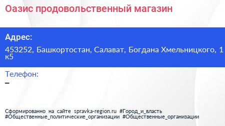 Оазис, продовольственный магазин по адресу 453252, Башкортостан, Салават, Богдана Хмельницкого, 1 к5 в дальнейшем Организация, размещена в следующих категориях:
