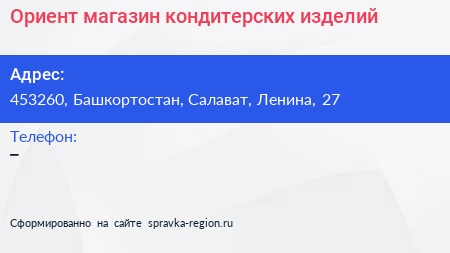 Ориент, магазин кондитерских изделий по адресу 453260, Башкортостан, Салават, Ленина, 27 в дальнейшем Организация, размещена в следующих категориях:
