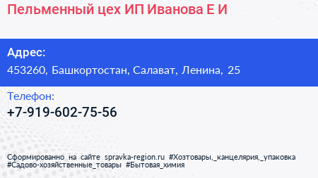 Пельменный цех, ИП Иванова Е.И. по адресу 453260, Башкортостан, Салават, Ленина, 25 в дальнейшем Организация, размещена в следующих категориях:
