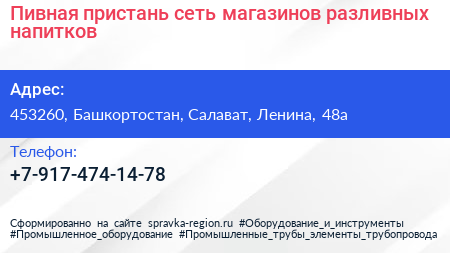 Пивная пристань, сеть магазинов разливных напитков по адресу 453260, Башкортостан, Салават, Ленина, 48а в дальнейшем Организация, размещена в следующих категориях: