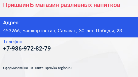 ПришвинЪ, магазин разливных напитков по адресу 453266, Башкортостан, Салават, 30 лет Победы, 23 в дальнейшем Организация, размещена в следующих категориях: