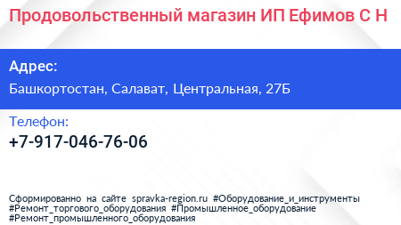 Продовольственный магазин, ИП Ефимов С.Н. по адресу Башкортостан, Салават, Центральная, 27Б в дальнейшем Организация, размещена в следующих категориях: