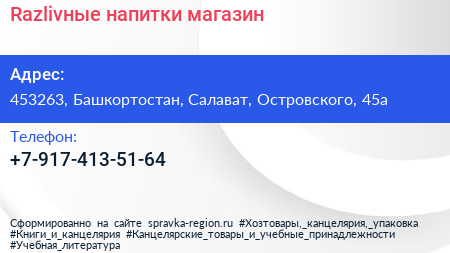 Razlivные нaпитки, магазин по адресу 453263, Башкортостан, Салават, Островского, 45а в дальнейшем Организация, размещена в следующих категориях: