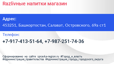 Razlivные нaпитки, магазин по адресу 453251, Башкортостан, Салават, Островского, 69а ст1 в дальнейшем Организация, размещена в следующих категориях: