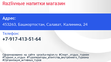 Razlivные нaпитки, магазин по адресу 453263, Башкортостан, Салават, Калинина, 24 в дальнейшем Организация, размещена в следующих категориях: