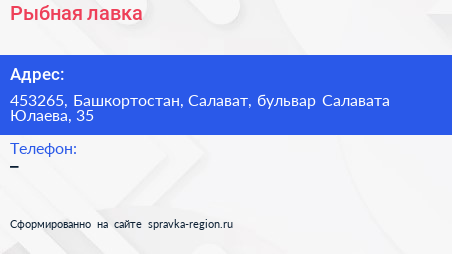 Рыбная лавка по адресу 453265, Башкортостан, Салават, бульвар Салавата Юлаева, 35 в дальнейшем Организация, размещена в следующих категориях: