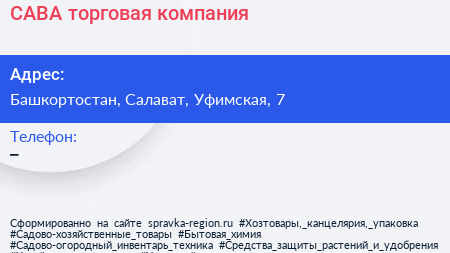 САВА, торговая компания по адресу Башкортостан, Салават, Уфимская, 7 в дальнейшем Организация, размещена в следующих категориях: