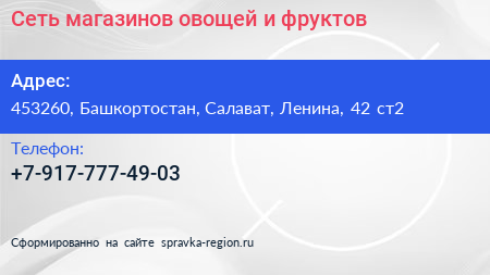 Сеть магазинов овощей и фруктов по адресу 453260, Башкортостан, Салават, Ленина, 42 ст2 в дальнейшем Организация, размещена в следующих категориях: