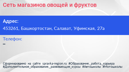 Сеть магазинов овощей и фруктов по адресу 453261, Башкортостан, Салават, Уфимская, 27а в дальнейшем Организация, размещена в следующих категориях: