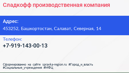 Сладкофф, производственная компания по адресу 453252, Башкортостан, Салават, Северная, 14 в дальнейшем Организация, размещена в следующих категориях: