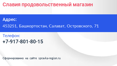 Славия, продовольственный магазин по адресу 453251, Башкортостан, Салават, Островского, 71 в дальнейшем Организация, размещена в следующих категориях: