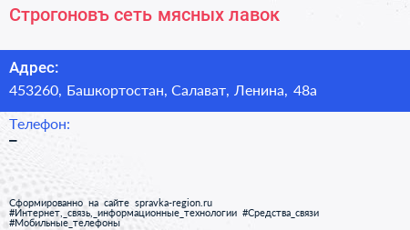 Строгоновъ, сеть мясных лавок по адресу 453260, Башкортостан, Салават, Ленина, 48а в дальнейшем Организация, размещена в следующих категориях: