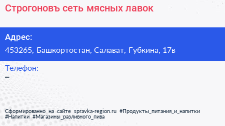 Строгоновъ, сеть мясных лавок по адресу 453265, Башкортостан, Салават, Губкина, 17в в дальнейшем Организация, размещена в следующих категориях: