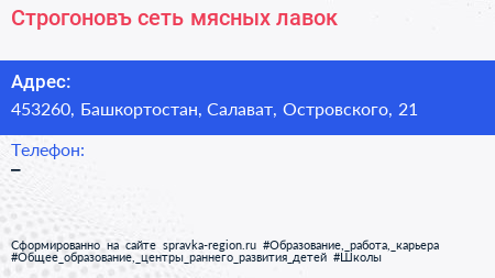 Строгоновъ, сеть мясных лавок по адресу 453260, Башкортостан, Салават, Островского, 21 в дальнейшем Организация, размещена в следующих категориях: