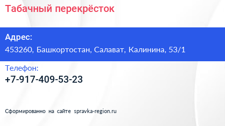 Табачный перекрёсток по адресу 453260, Башкортостан, Салават, Калинина, 53/1 в дальнейшем Организация, размещена в следующих категориях: