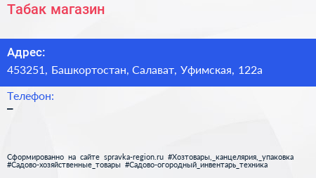 Табак, магазин по адресу 453251, Башкортостан, Салават, Уфимская, 122а в дальнейшем Организация, размещена в следующих категориях: