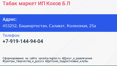 Табак-маркет, ИП Кохов Б.Л. по адресу 453252, Башкортостан, Салават, Колхозная, 25а в дальнейшем Организация, размещена в следующих категориях: