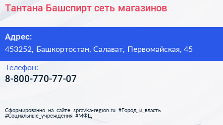 Тантана-Башспирт, сеть магазинов по адресу 453252, Башкортостан, Салават, Первомайская, 45 в дальнейшем Организация, размещена в следующих категориях: