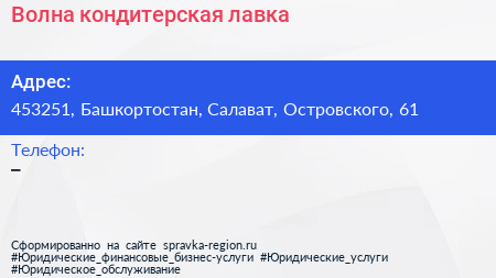 Волна, кондитерская лавка по адресу 453251, Башкортостан, Салават, Островского, 61 в дальнейшем Организация, размещена в следующих категориях: