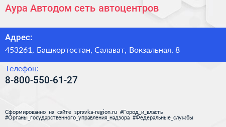Аура Автодом, сеть автоцентров по адресу 453261, Башкортостан, Салават, Вокзальная, 8 в дальнейшем Организация, размещена в следующих категориях: