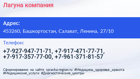 Лагуна, компания по адресу 453260, Башкортостан, Салават, Ленина, 27/10 в дальнейшем Организация, размещена в следующих категориях: