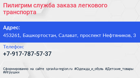 Пилигрим, служба заказа легкового транспорта по адресу 453261, Башкортостан, Салават, проспект Нефтяников, 3 в дальнейшем Организация, размещена в следующих категориях: