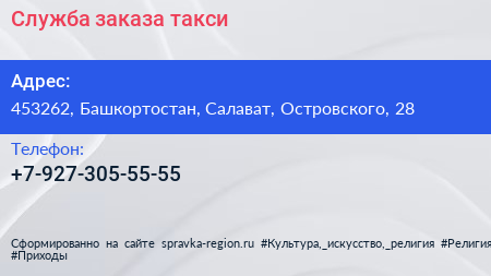 Служба заказа такси по адресу 453262, Башкортостан, Салават, Островского, 28 в дальнейшем Организация, размещена в следующих категориях:
