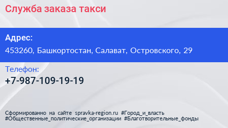 Служба заказа такси по адресу 453260, Башкортостан, Салават, Островского, 29 в дальнейшем Организация, размещена в следующих категориях: