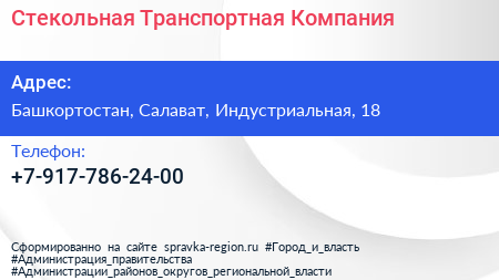 Стекольная Транспортная Компания по адресу Башкортостан, Салават, Индустриальная, 18 в дальнейшем Организация, размещена в следующих категориях: