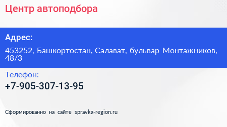 Центр автоподбора по адресу 453252, Башкортостан, Салават, бульвар Монтажников, 48/3 в дальнейшем Организация, размещена в следующих категориях: