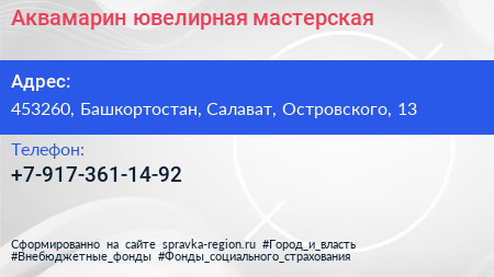 Аквамарин, ювелирная мастерская по адресу 453260, Башкортостан, Салават, Островского, 13 в дальнейшем Организация, размещена в следующих категориях: