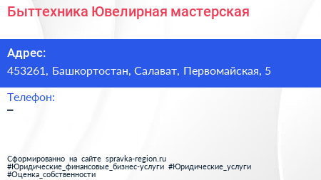 Быттехника, Ювелирная мастерская по адресу 453261, Башкортостан, Салават, Первомайская, 5 в дальнейшем Организация, размещена в следующих категориях: