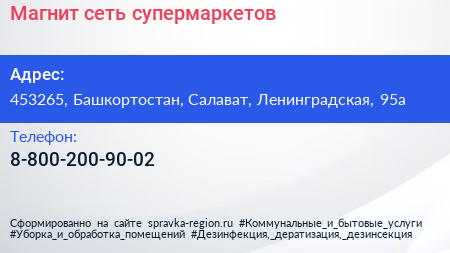 Магнит, сеть супермаркетов по адресу 453265, Башкортостан, Салават, Ленинградская, 95а в дальнейшем Организация, размещена в следующих категориях: