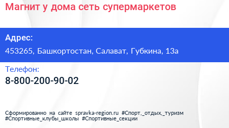 Магнит у дома, сеть супермаркетов по адресу 453265, Башкортостан, Салават, Губкина, 13а в дальнейшем Организация, размещена в следующих категориях: