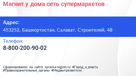 Магнит у дома, сеть супермаркетов по адресу 453252, Башкортостан, Салават, Строителей, 48 в дальнейшем Организация, размещена в следующих категориях: