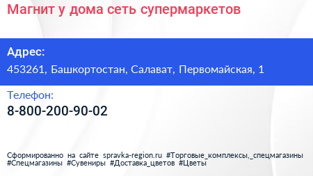 Магнит у дома, сеть супермаркетов по адресу 453261, Башкортостан, Салават, Первомайская, 1 в дальнейшем Организация, размещена в следующих категориях: