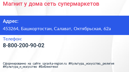 Магнит у дома, сеть супермаркетов по адресу 453264, Башкортостан, Салават, Октябрьская, 62а в дальнейшем Организация, размещена в следующих категориях: