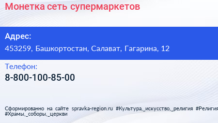 Монетка, сеть супермаркетов по адресу 453259, Башкортостан, Салават, Гагарина, 12 в дальнейшем Организация, размещена в следующих категориях: