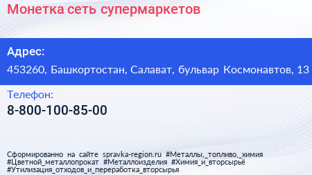 Монетка, сеть супермаркетов по адресу 453260, Башкортостан, Салават, бульвар Космонавтов, 13 в дальнейшем Организация, размещена в следующих категориях: