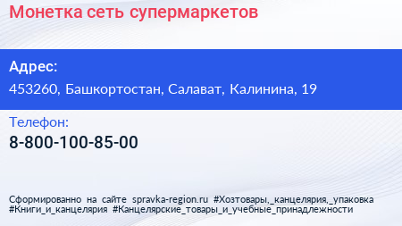 Монетка, сеть супермаркетов по адресу 453260, Башкортостан, Салават, Калинина, 19 в дальнейшем Организация, размещена в следующих категориях:
