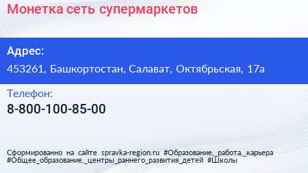Монетка, сеть супермаркетов по адресу 453261, Башкортостан, Салават, Октябрьская, 17а в дальнейшем Организация, размещена в следующих категориях: