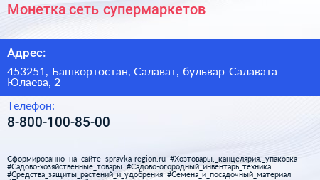Монетка, сеть супермаркетов по адресу 453251, Башкортостан, Салават, бульвар Салавата Юлаева, 2 в дальнейшем Организация, размещена в следующих категориях: