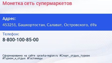 Монетка, сеть супермаркетов по адресу 453251, Башкортостан, Салават, Островского, 69а в дальнейшем Организация, размещена в следующих категориях: