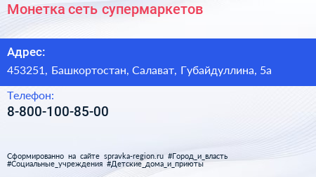 Монетка, сеть супермаркетов по адресу 453251, Башкортостан, Салават, Губайдуллина, 5а в дальнейшем Организация, размещена в следующих категориях: