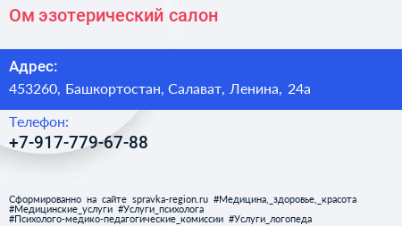 Ом, эзотерический салон по адресу 453260, Башкортостан, Салават, Ленина, 24а в дальнейшем Организация, размещена в следующих категориях: