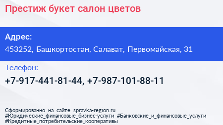 Престиж букет, салон цветов по адресу 453252, Башкортостан, Салават, Первомайская, 31 в дальнейшем Организация, размещена в следующих категориях: