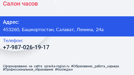 Салон часов по адресу 453260, Башкортостан, Салават, Ленина, 24а в дальнейшем Организация, размещена в следующих категориях: