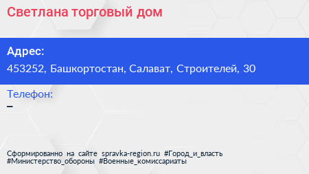 Светлана, торговый дом по адресу 453252, Башкортостан, Салават, Строителей, 30 в дальнейшем Организация, размещена в следующих категориях: