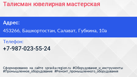 Талисман, ювелирная мастерская по адресу 453266, Башкортостан, Салават, Губкина, 10а в дальнейшем Организация, размещена в следующих категориях: